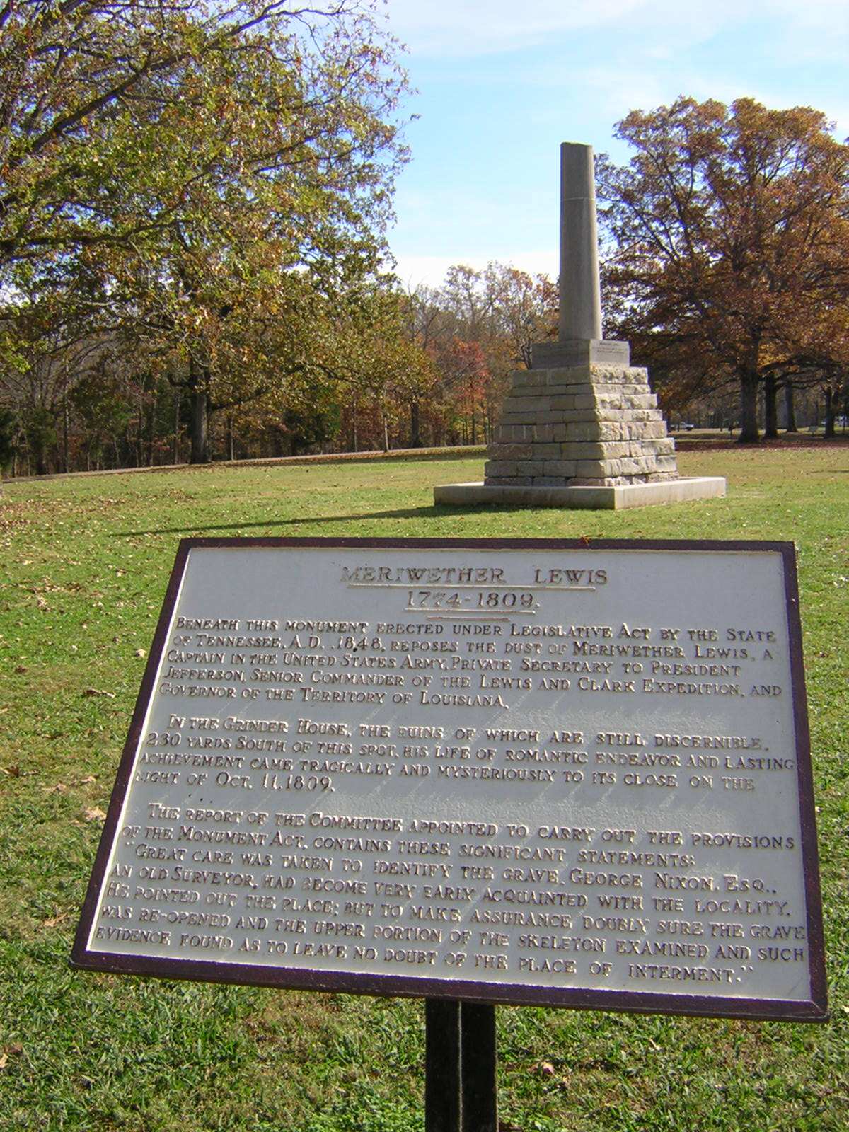 Natchez Trace Parkway. Lewis' grave is marked by a large monument in the form of a broken shaft,